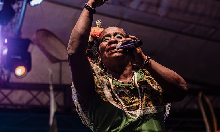 Traditional Bullerengue singer Darlina Sáenz leads a hypnotic night of drum-fuelled Afro-Colombian music and dance with Akolá Tambó. With the combination of guttural earthy vocals, syncopated hand…